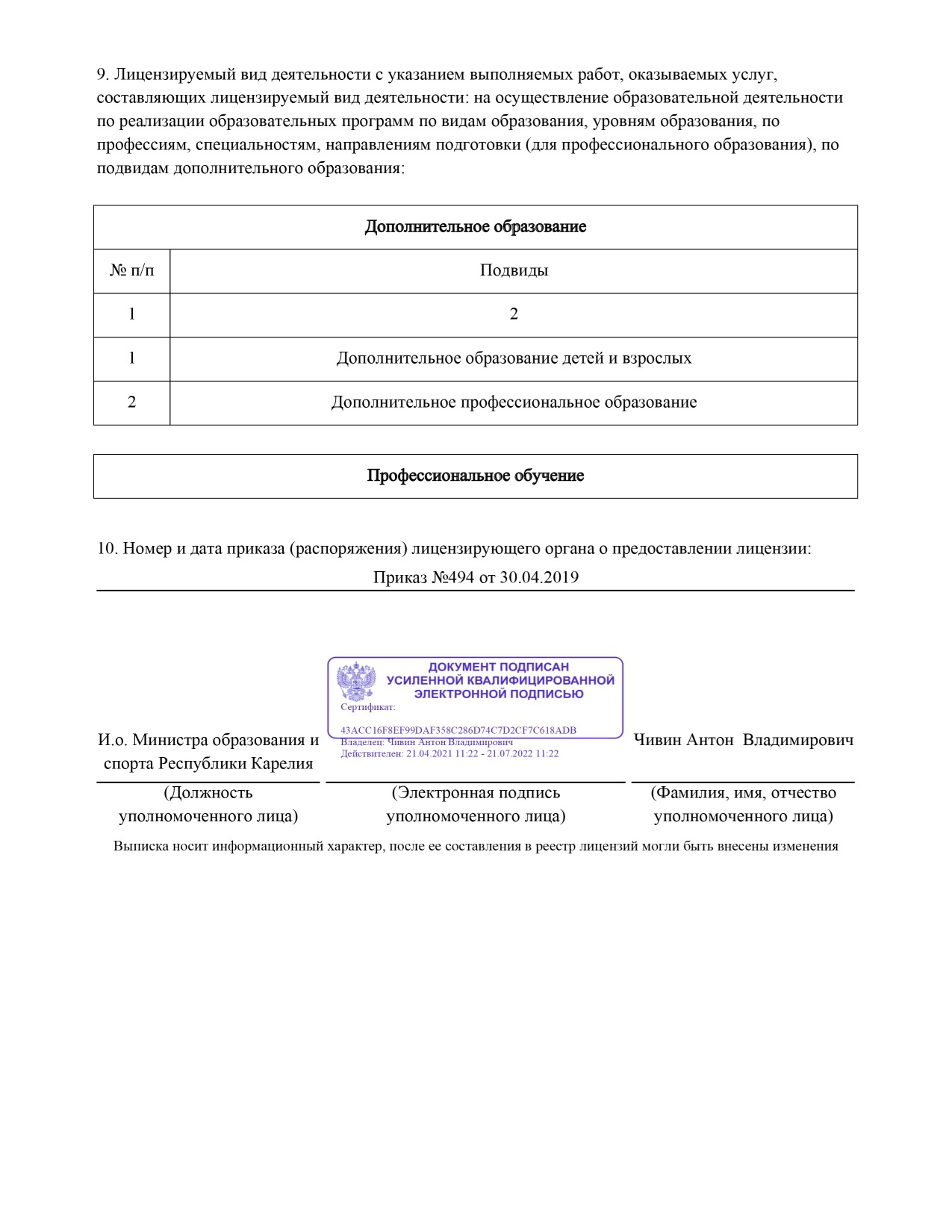 Предыдущая Лицензия №2338 от 01.09.2014, выданная Министерством образования Республики Карелия утратила силу. С приказом на переоформление лицензии на осуществление образовательной деятельности можно ознакомиться ЗДЕСЬ.